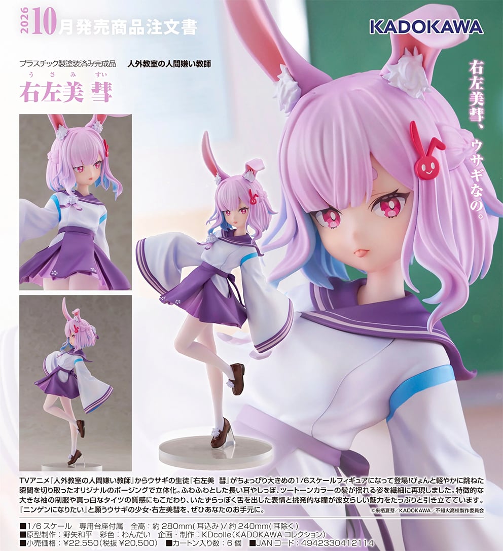 總價: $1100 訂金: $500 ⚠️此乃訂購頁面,繳付訂金後,需取貨時進行補款支付餘額:$600⚠️ 截訂日期: 2026年3月26日 (※因預訂名額有限,如額滿有可能提前結束,請見諒※) 發售日: 2026年10月 商品狀態: 全新未開封 版本: 行版 比例: 1/6,全高約28cm (含兔耳) / 約24cm (不含兔耳) 包裝尺寸: TBC 重量: TBC 物料: ABS、PVC 生產商: 角川 KADOKAWA JAN code: 4942330412114 <<預訂須知:>> 1) 此乃訂購頁面,繳付訂金後,⚠️需取貨時進行補款,支付餘額⚠️,若選擇繳付全款的話則無需再補款。 2) 煩請於指定日期內繳付訂金以完成預訂,若未能如期付款,訂單將作取消。 3) 落實訂購貨品後,不能轉訂其他貨品,如需取消訂單,訂金恕不退還。 4) 商品有可能因故變更出貨日期,最終發貨日由官方網站公佈為準,除因生產商或供應商問題未能供貨,否則恕不能取消訂單安排退款。 5) 如因生產商或供應商未能全數供貨,所有訂金將獲全數退回。 6) 照片與實際商品可能會出現稍微差異的情況。 7) 確定下單訂購即視為同意遵守以上相關規定,本店保留最終決定之權利。 <<取貨安排:>> 1) 可選擇到本店門市自取 或 以順豐速運 <運費到付> 形式寄送,客人在收貨時才付運費(運費由順豐速運計算及直接向客人收取)。 2) 預訂貨品到貨後,本店會以WhatsApp 或 SMS 訊息通知取貨, 選擇門市取貨的客人: 另外會以電郵發出「訂單領取通知」,客人可以帶同此電郵的QR code 到門市取貨,或取貨時說出閣下的聯絡電話號碼及出示訊息即可。(門市營業時間: 12:30pm-9:00PM) 選擇快遞送貨的客人: 會以訊息 或 電郵通知補款,確認收到後本店會在三個工作天內(不包括星期六、日及公眾假期)寄出貨品,並會以訊息及電郵通知追蹤號碼已出貨。 所需運費可參考以下順豐速運官網: https://bit.ly/3DY0OPc ※因貨品包裝後的外盒體積都會影響運費計算,如有任何疑問亦可先以訊息聯絡我們客服查詢※ 3) 訂購的貨品,需到貨通知後14天內到取,若未能如期取貨,將作棄單處理,訂金作廢不作退回,恕不另行通知。