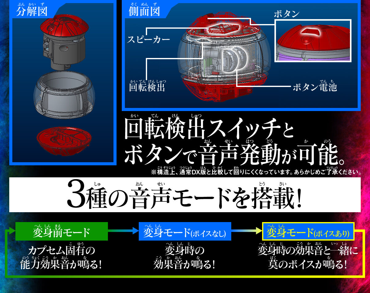 總價: $212 訂金: $100 ⚠️此乃訂購頁面,繳付訂金後,需取貨時進行補款支付餘額:$112⚠️ 截訂日期: 2025年12月27日(※因預訂名額有限,如額滿有可能提前結束,請見諒※) 發售日: 2026年3月  商品狀態: 全新未開封 版本: 香港行版 比例: H約4.5cm× W約5cm× D約5cm(共通) 包裝尺寸: TBC 重量: TBC 物料: ABS・PC 生產商: Bandai JAN code: 4582769903410 商品介紹: 本商品作為第二彈,內容包括「科技湧動 夢境膠囊」與「肌體飛翼 夢境膠囊」。所有組件均以全新規格打造,在與普通DX版相同的本體尺寸內,裝載了電子零件。除了新配置的操作按鈕外,更配備了可檢測膠囊獨有轉動功能的感應鈕,能透過多種操作從膠囊本體直接發動音效。 商品設有可切換的聲音模式,共分為三種:可發動膠囊獨有能力效果音的「變身前模式」、可發動變身時效果音的「變身模式(無人聲)」,以及配合變身效果音並響起萬津莫(飾演:今井竜太郎)聲音的「變身模式(有人聲)」。 與普通DX版相同,本商品可與另售的「DX ZEZTZ變身腰帶」進行連動。將夢境膠囊裝嵌至變身腰帶並旋轉,即可配合變身腰帶發出的變身音效,從膠囊發動追加的效果音。此外,在執行必殺技操作時,也能觸發必殺技後的追加效果音。 此外,本商品更收錄了主人公・萬津莫的角色語音。各膠囊包含共通的3種聲音,並各自收錄了6種萬津莫變身前的語音及劇中令人印象深刻的台詞,讓玩家能盡情享受角色扮演的樂趣。 在「變身前模式」下轉動膠囊,即可發動獨有能力啟動時的效果音。而「科技湧動 夢境膠囊」更額外收錄了第一集所用的戰鬥及必殺技合共2段背景音樂。 <<預訂須知:>> 1) 此乃訂購頁面,繳付訂金後,⚠️需取貨時進行補款,支付餘額⚠️,若選擇繳付全款的話則無需再補款。 2) 煩請於指定日期內繳付訂金以完成預訂,若未能如期付款,訂單將作取消。 3) 落實訂購貨品後,不能轉訂其他貨品,如需取消訂單,訂金恕不退還。 4) 商品有可能因故變更出貨日期,最終發貨日由官方網站公佈為準,除因生產商或供應商問題未能供貨,否則恕不能取消訂單安排退款。 5) 如因生產商或供應商未能全數供貨,所有訂金將獲全數退回。 6) 照片與實際商品可能會出現稍微差異的情況。 7) 確定下單訂購即視為同意遵守以上相關規定,本店保留最終決定之權利。 <<取貨安排:>> 1) 可選擇到本店門市自取 或 以順豐速運 <運費到付> 形式寄送,客人在收貨時才付運費(運費由順豐速運計算及直接向客人收取)。 2) 預訂貨品到貨後,本店會以WhatsApp 或 SMS 訊息通知取貨, 選擇門市取貨的客人: 另外會以電郵發出「訂單領取通知」,客人可以帶同此電郵的QR code 到門市取貨,或取貨時說出閣下的聯絡電話號碼及出示訊息即可。(門市營業時間: 12:30pm-9:00PM) 選擇快遞送貨的客人: 會以訊息 或 電郵通知補款,確認收到後本店會在三個工作天內(不包括星期六、日及公眾假期)寄出貨品,並會以訊息及電郵通知追蹤號碼已出貨。 所需運費可參考以下順豐速運官網: https://bit.ly/3DY0OPc ※因貨品包裝後的外盒體積都會影響運費計算,如有任何疑問亦可先以訊息聯絡我們客服查詢※ 3) 訂購的貨品,需到貨通知後14天內到取,若未能如期取貨,將作棄單處理,訂金作廢不作退回,恕不另行通知。
