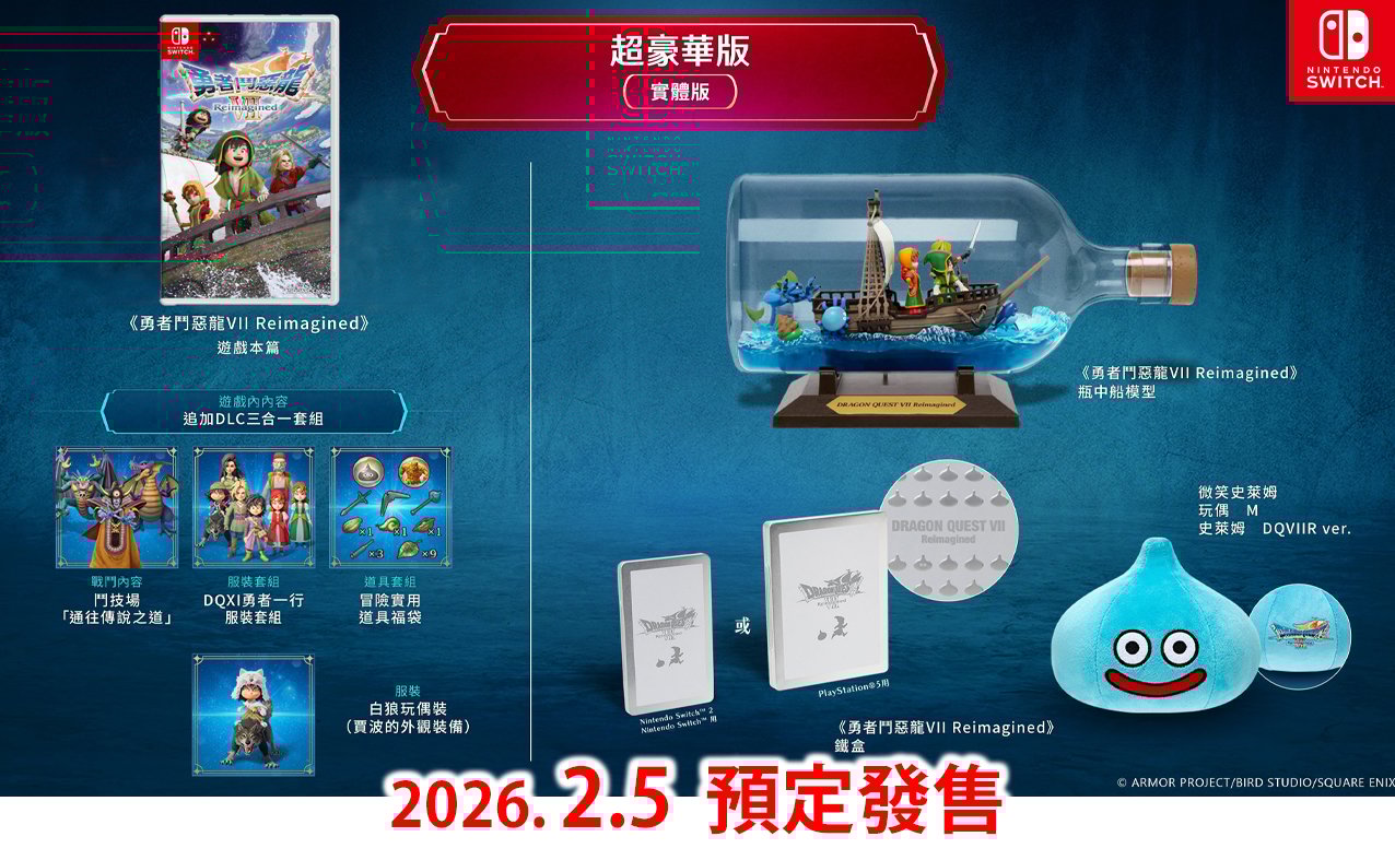 總價: 未定 訂金: $300 ⚠️此乃訂購頁面,繳付訂金後,需取貨時進行補款支付餘額:$238⚠️ 截訂日期: 因預訂名額有限,如額滿有可能提前結束,請見諒 發售日: 2026年2月5日 平台: Nintendo Switch 版本: 香港行版 字幕: 中文 語音: TBC 發行: SQUARE ENIX 商品狀態: 全新未開封。超豪華版包括: ① 《勇者鬥惡龍 VII Reimagined》實體版遊戲軟體 ② 《勇者鬥惡龍 7 Reimagined》追加 DLC 三合一套組 ③ 追加 DLC:鬥技場「通往傳說之道」 ④ 追加 DLC:DQXI 勇者一行服裝套組 ⑤ 追加 DLC:冒險實用道具福袋 ⑥ 《勇者鬥惡龍 7 Reimagined》鐵盒 ⑦ 《勇者鬥惡龍 7 Reimagined》瓶中船模型 ⑧ 微笑史萊姆玩偶 M 史萊姆 DQVIIR ver. ⑨ 白狼玩偶裝(賈波的外觀裝備) 包裝尺寸: TBC 重量: TBC JAN code: TBC <<預訂須知:>> 1) 此乃訂購頁面,繳付訂金後,⚠️需取貨時進行補款,支付餘額⚠️,若選擇繳付全款的話則無需再補款。 2) 煩請於指定日期內繳付訂金以完成預訂,若未能如期付款,訂單將作取消。 3) 落實訂購貨品後,不能轉訂其他貨品,如需取消訂單,訂金恕不退還。 4) 商品有可能因故變更出貨日期,最終發貨日由官方網站公佈為準,除因生產商或供應商問題未能供貨,否則恕不能取消訂單安排退款。 5) 如因生產商或供應商未能全數供貨,所有訂金將獲全數退回。 6) 照片與實際商品可能會出現稍微差異的情況。 7) 確定下單訂購即視為同意遵守以上相關規定,本店保留最終決定之權利。 <<取貨安排:>> 1) 可選擇到本店門市自取 或 以順豐速運 <運費到付> 形式寄送,客人在收貨時才付運費(運費由順豐速運計算及直接向客人收取)。 2) 預訂貨品到貨後,本店會以WhatsApp 或 SMS 訊息通知取貨, 選擇門市取貨的客人: 另外會以電郵發出「訂單領取通知」,客人可以帶同此電郵的QR code 到門市取貨,或取貨時說出閣下的聯絡電話號碼及出示訊息即可。(門市營業時間: 12:30pm-9:00PM) 選擇快遞送貨的客人: 會以訊息 或 電郵通知補款,確認收到後本店會在三個工作天內(不包括星期六、日及公眾假期)寄出貨品,並會以訊息及電郵通知追蹤號碼已出貨。 所需運費可參考以下順豐速運官網: https://bit.ly/3DY0OPc ※因貨品包裝後的外盒體積都會影響運費計算,如有任何疑問亦可先以訊息聯絡我們客服查詢※ 3) 訂購的貨品,需到貨通知後14天內到取,若未能如期取貨,將作棄單處理,訂金作廢不作退回,恕不另行通知。