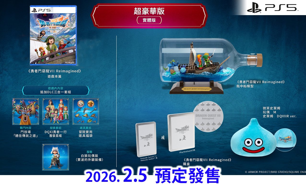 總價: 未定 訂金: $300 ⚠️此乃訂購頁面,繳付訂金後,需取貨時進行補款支付餘額:$238⚠️ 截訂日期: 因預訂名額有限,如額滿有可能提前結束,請見諒 發售日: 2026年2月5日 平台: PS5 版本: 香港行版 字幕: 中文 語音: TBC 發行: SQUARE ENIX 商品狀態: 全新未開封。超豪華版包括: ① 《勇者鬥惡龍 VII Reimagined》實體版遊戲軟體 ② 《勇者鬥惡龍 7 Reimagined》追加 DLC 三合一套組 ③ 追加 DLC:鬥技場「通往傳說之道」 ④ 追加 DLC:DQXI 勇者一行服裝套組 ⑤ 追加 DLC:冒險實用道具福袋 ⑥ 《勇者鬥惡龍 7 Reimagined》鐵盒 ⑦ 《勇者鬥惡龍 7 Reimagined》瓶中船模型 ⑧ 微笑史萊姆玩偶 M 史萊姆 DQVIIR ver. ⑨ 白狼玩偶裝(賈波的外觀裝備) 包裝尺寸: TBC 重量: TBC JAN code: TBC <<預訂須知:>> 1) 此乃訂購頁面,繳付訂金後,⚠️需取貨時進行補款,支付餘額⚠️,若選擇繳付全款的話則無需再補款。 2) 煩請於指定日期內繳付訂金以完成預訂,若未能如期付款,訂單將作取消。 3) 落實訂購貨品後,不能轉訂其他貨品,如需取消訂單,訂金恕不退還。 4) 商品有可能因故變更出貨日期,最終發貨日由官方網站公佈為準,除因生產商或供應商問題未能供貨,否則恕不能取消訂單安排退款。 5) 如因生產商或供應商未能全數供貨,所有訂金將獲全數退回。 6) 照片與實際商品可能會出現稍微差異的情況。 7) 確定下單訂購即視為同意遵守以上相關規定,本店保留最終決定之權利。 <<取貨安排:>> 1) 可選擇到本店門市自取 或 以順豐速運 <運費到付> 形式寄送,客人在收貨時才付運費(運費由順豐速運計算及直接向客人收取)。 2) 預訂貨品到貨後,本店會以WhatsApp 或 SMS 訊息通知取貨, 選擇門市取貨的客人: 另外會以電郵發出「訂單領取通知」,客人可以帶同此電郵的QR code 到門市取貨,或取貨時說出閣下的聯絡電話號碼及出示訊息即可。(門市營業時間: 12:30pm-9:00PM) 選擇快遞送貨的客人: 會以訊息 或 電郵通知補款,確認收到後本店會在三個工作天內(不包括星期六、日及公眾假期)寄出貨品,並會以訊息及電郵通知追蹤號碼已出貨。 所需運費可參考以下順豐速運官網: https://bit.ly/3DY0OPc ※因貨品包裝後的外盒體積都會影響運費計算,如有任何疑問亦可先以訊息聯絡我們客服查詢※ 3) 訂購的貨品,需到貨通知後14天內到取,若未能如期取貨,將作棄單處理,訂金作廢不作退回,恕不另行通知。